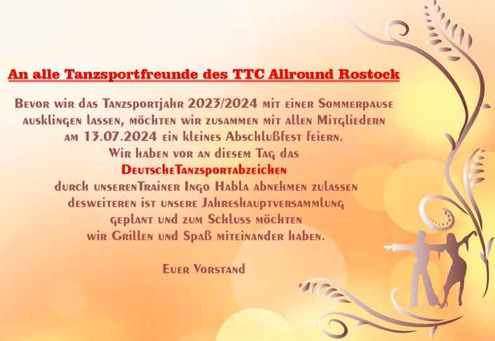 Vor der Sommerpause kommt die jährliche Mitgliederversammlung. Diesmal könnt ihr das Nützliche mit dem Angenehmen verbinden und auch noch gleich das Deutsche Tanzsportabzeichen erwerben.